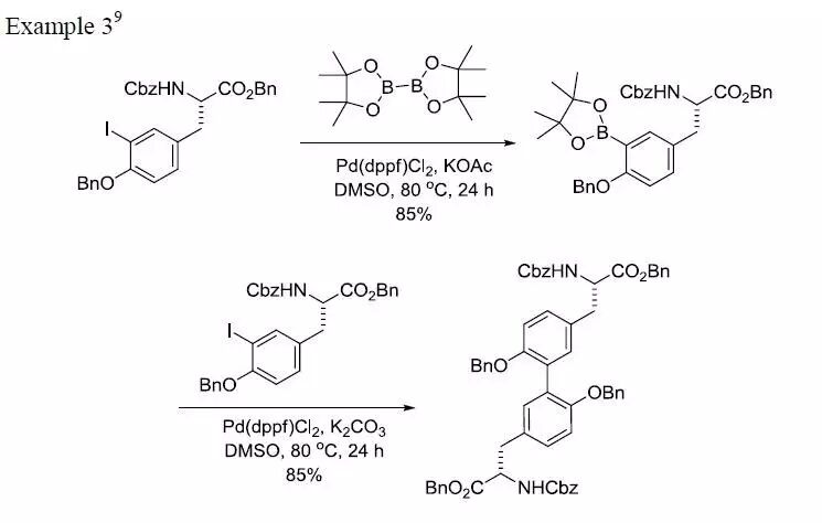 钯催化下芳基卤代物和双联硼试剂反应制备芳基硼酸酯的反应。也被称为Hosomi-Miyaura硼酸化反应。