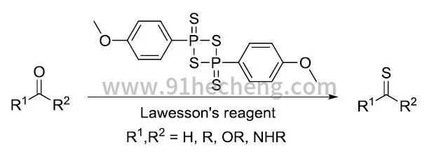 劳森试剂是一个温和的易于操作的氧硫交换试剂,最常见的应用是硫代酰胺的制取,将羰基化合物转化为硫羰基化合物,可以反应的底物包括酮、酯、内酯、酰胺、内酰胺、醌等。富电子的羰基更容易反应。与α,β-不饱和醛酮反应时,双键不受影响。而用 P4S10 等硫代试剂却需要大量过量和高温条件。