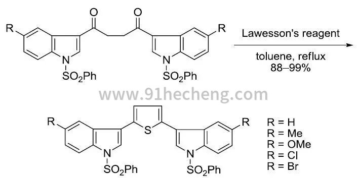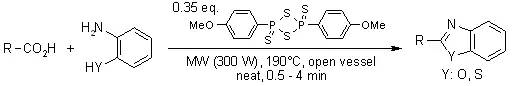 劳森试剂【2,4-Bis(4-methoxyphenyl)-1,3-dithiadiphosphetane-2,4-disulfide】是一个常用于制取有机硫化合物的化学试剂,常温常压下为微黄色的固体粉末,具有强烈难闻的腐烂气味。1956年首先由芳烃与十硫化四磷反应制得。瑞典化学家Sven-Olov Lawesson仔细研究了其与有机化合物的反应,使其应用大大推广,因此名称也由此得来。劳森试剂的分子含有硫和磷交替组成的四元环结构。加热时发生解聚,生成两个不稳定的硫代磷叶立德(R-PS2),它们是主要的反应活性中间体。用两个取代基不同的劳森试剂反应时,在产物的31NMR谱中观测到了取代基发生互换的分子,因此证实了中间体R-PS2的存在。