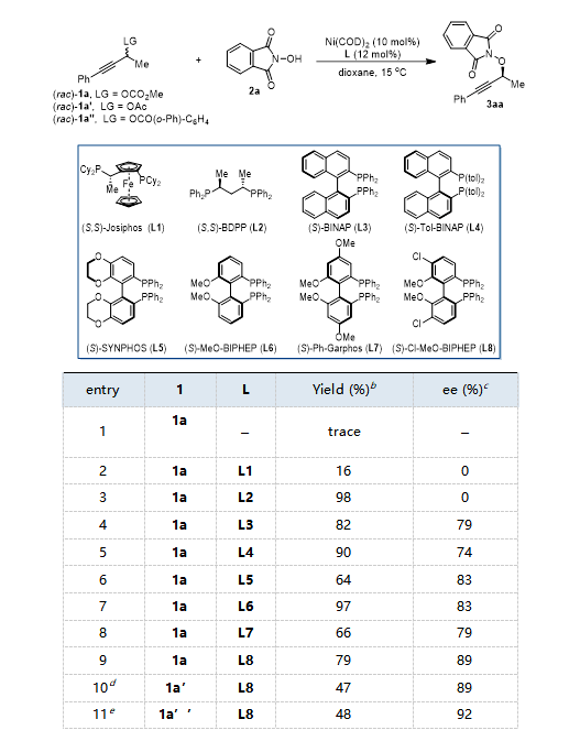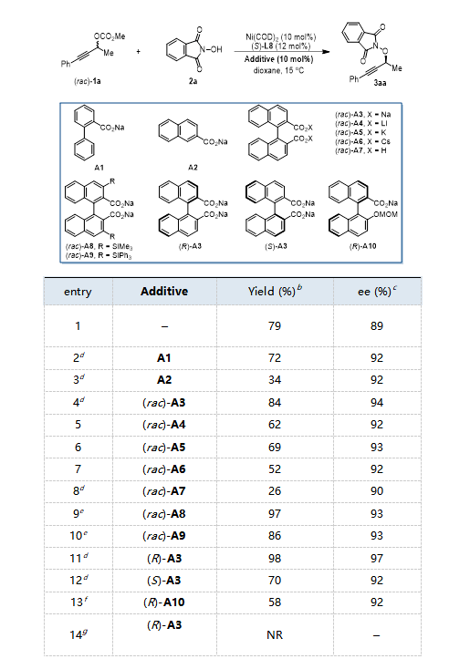 作者继续探索了不同类型羧酸盐对该反应的影响(图3),发现当使用联萘羧酸钠作为添加剂时,该反应的立体选择性得到了进一步提升(图3,entry 4)。研究发现,联萘骨架手性构型及3,3’-位取代基对反应的立体选择性有着不同程度的影响,当选用(R)-A3作为添加剂时,反应可取得最优结果,最终以98%的收率及97% ee的对映选择性得到目标产物3aa(图3,entry 11)。aReactions were conducted with (rac)-1a (0.2 mmol), 2a (0.1 mmol), Ni(COD)2 (10 mol%), (S)-L8 (12 mol%), and additive (10 mol%) in dioxane (4.0 mL) at 15 oC, 12 h. d18 h. e72 h. f48 h. gIn the absence of (S)-L8.