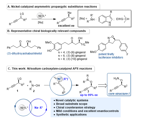 作者应用手性镍膦配合物和联萘羧酸联合催化体系,高效、高对映选择性地实现了炔丙基酯和N-羟基邻苯二甲酰亚胺的不对称氧-炔丙基化反应。机理研究表明,手性羧酸根可作为金属镍的阴离子配体,辅助调节反应中心的立体化学,实现炔丙醇衍生物的高立体选择性合成。作者还应用该合成方法学,实现了生物活性分子和天然产物(S)-dihydroyashabushiketol的不对称全合成,展现了良好的应用前景。https://pubs.acs.org/doi/10.1021/jacs.1c11044