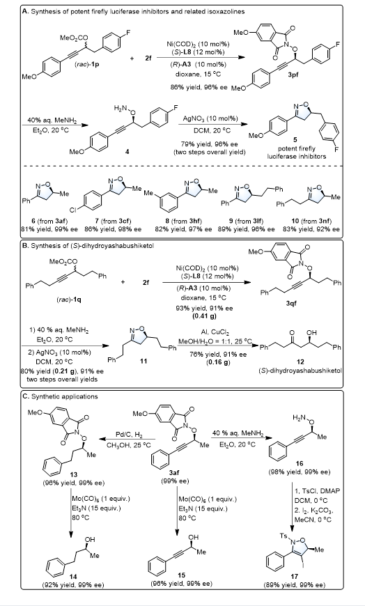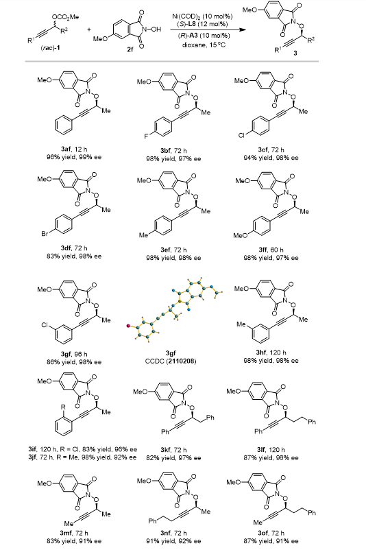 作者接着对炔丙基酯类底物的普适性进行了探究(图5),该反应具有良好的底物适用性,各种不同取代的炔丙基酯类底物都能顺利参与反应,并且具有较高的收率和优秀的对映选择性。aReactions were conducted with (rac)-1 (0.2 mmol), 2f (0.1 mmol), Ni(COD)2 (10 mol%), (S)-L8 (12 mol%), and (R)-A3 (10 mol%) in dioxane (4.0 mL) at 15 oC, 12-120 h.