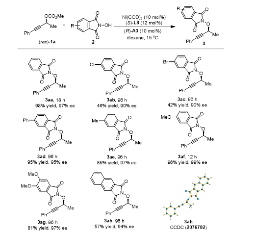 接下来,作者在最优条件下对N-羟基邻苯二甲酰亚胺类底物的普适性进行了探索(图4)。无论N-羟基邻苯二甲酰亚胺类底物的苯环上带有吸电子基团或给电子基团,反应均能顺利发生,以良好的产率和优异的对映选择性得到目标产物。aReactions were conducted with (rac)-1a (0.2 mmol), 2 (0.1 mmol), Ni(COD)2 (10 mol%), (S)-L8 (12 mol%), and (R)-A3 (10 mol%) in dioxane (4.0 mL) at 15 oC.