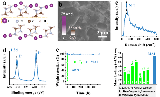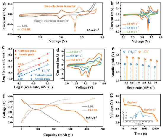 通讯作者:Prof. ZHI Chunyi, Prof. He Hongyan论文DOI:10.1002/anie.202113576我们提出了一种高效的电解液调制策略来实现卤素碘在有机锂金属体系中的可逆多价态转变,并选取卤化盐作为活性碘源替代传统碘单质作为概念验证,构建了前所未有的基于两电子转化化学的有机高性能锂碘电池。转化型锂碘电池基于碘正极在单质态和离子态间的完全可逆转变进行运转,极具实际应用前景。然而,迄今为止报道的有机锂-碘电池均基于碘单质和碘离子之间的可逆转变,对应一个单电子类型的转化模式。因此,得到的锂碘电池都只能实现221 mAh g-1以内的低比质量放电容量(理论上限)和约2.91 V的低放电电压平台。当前关乎高价碘,比如碘酸根和次碘酸根,在有机体系或者水系电解液中可逆转化的尝试均以失败告终,因为正价态的碘离子的热力学不稳定性。然而这并不能扼杀研究者对推动高价态碘转化化学的热情,因为及其可观的电压和容量提升。传统锂碘电池的另一个缺点是单质碘的热力学不稳定性。单质碘即使在常温常压环境中也会自发升华,很难长时间储存。尽管有相当多的努力致力于开发各种多孔的宿主来固定碘单质和反应产物,然而当前主-客体相互作用是由有限强度的物理吸附主导的,导致循环过程中反应产物发生不可避免的穿梭行为。1:高电负性的Cl-离子可以稳定有机锂碘电池在高电位处生成的正价态I+离子,从而激活I0与I+之间的可逆氧化还原,实现了碘的两电子可逆转化(I-/I+)。2:开发了甲基碘化铵(MAI)作为传统单质碘的替代物。新的卤化盐作为碘源表现出优异的内在热稳定性和电化学活性。3:激活的I0/I+氧化还原化学带来全新的放电电压平台(3.42 V),将锂碘电池放电总容量提高约一倍,至408 mAh g-1,并将能量密度提高到1324 Wh kg-1,远远超过了当前所有金属-碘电池。4:DFT模拟和多重光谱表征揭示了Cl-离子在高电位范围内对I+离子的有效固定作用。5:激活的两电子转化化学表现出卓越的低温不敏感性。在-25°C时,有机锂碘电池以损耗20%容量的代价稳定循环超过2500次。如图1所示,一旦正价的I+离子被激活并稳定,可逆的I0/I+氧化还原对将触发一个新的转化平台,理论上比I-/I0高约0.5 V。此外,双电子转化模式有望将理论放电容量翻倍,达到422 mAh g-1。由于触发的转化转换平台处于较高的电位,能量密度有望获得超过原始值200%的显著提高。图2a展示了所选MAI (CH3NH3I)材料的晶体结构,其中I-负离子通过离子键与N结合。扫描电子显微镜(SEM)图像显示MAI晶体表面粗糙不平(图2b)。能量色散x射线光谱(EDX)结果显示I和C元素在其中均匀分布,两者的质量比约为79:21。在拉曼光谱中,110 cm-1处的主峰源于N-I键的振动,如图2c所示。此外,x射线光电子能谱(XPS)技术进一步分析了I元素的详细化学价态。不出所料,在高分辨率的I3d XPS光谱中发现了两个明显的峰,分别位于619 eV和630 eV,对应于N-I键,其中I呈负价(图2d)。具有重大实际意义的是,新的卤化物碘源具有内在的热稳定性,远优于传统的单质I2。直观而言,在60℃的氮气保护条件下,I2在仅仅2小时内便挥发完全,而MAI材料可以在较长时间内保持稳定的重量。其在480小时内的失重仅为1.8 wt.%(图2e)。此外,MAI中活性碘负载质量高达63 wt%,优于大多数报道的由多孔导体(如,多孔碳,金属-有机框架,聚乙烯基吡啶酮)和单质I2组成的复合电极,如图2f所示。实际上,多孔碳尽管质量轻,孔隙丰富,却很难携带比其自身重量更多的I2。我们研究了MAI正极与Li金属负极配对在含有LiCl添加剂的改性电解液中的电化学性能,同时以商用电解液作为参考。为了方便起见,商业电解液和修饰的电解质分别被缩写为LDL和Cl-LDL。MAI//LDL//Li电池的开路电压在2.4-2.6 V左右,因为初始活性物质是I-离子而不是I2。因此,电池采取先充电后放电的模式。图3a给出了电池在0.5 mV s-1扫速下的CV曲线。MAI//LDL//Li电池在3.00/2.96 V处存在一对氧化还原峰,对应于I-/I3-的单一氧化还原阶段。与之形成鲜明对比的是MAI//Cl-LDL//Li电池中可以识别出两对明确的氧化还原峰。除了常见的3.00/2.96 V,在3.45/3.34 V位置处被识别到一个新的氧化还原对,对应一种激活的全新的可逆转化化学。值得注意的是,两个峰的电压差正好为0.4-0.5 V,表明新的氧化还原对可能是I0/I+。另外,半峰宽窄的尖峰和较强的电流响应表明该半反应具有良好的氧化还原动力学和优异的可逆性。为了阐明MAI//Cl-LDL//Li电池在两阶段氧化还原过程中的动力学演化,我们在0.1-1.0 mV s-1的扫描范围内进行了CV测试。如图3b所示,对于所有速率,电池中均可以识别出两对明显的氧化还原峰,没有任何湍流或杂散痕迹,这意味着可逆转换是高效且稳定的。得益于快速的转化动力学,峰值电压仅从0.1 mV s-1时的2.97/3.36 V移动到1.0 mV s-1时的2.95/3.31 V。仅为0.02 V和0.05 V的电压滞后可以忽略不计。在电荷存储模式方面,我们通过分离响应电流进一步计算了四个氧化还原峰的b值。如图3c所示,两对氧化还原峰的b值分别为0.60/0.58和0.63/0.57。因此,新的I0/I+氧化还原反应被认为是由电容控制和扩散控制过程共同控制,后者占据主导地位。在2到10 mV s-1的大扫描速率情形下,整个I-/I0+转换仍保留明显的两级特性(图3d)。作为补充分析,我们提取和比较了两个单独反应随扫描速率演变的反应电位(图3e)。值得注意的是,当扫描速率增加100倍时,I0/I+仅产生低至0.24 V的电压滞后,表明优异的转换动力。图3f