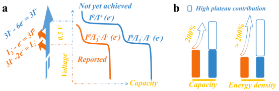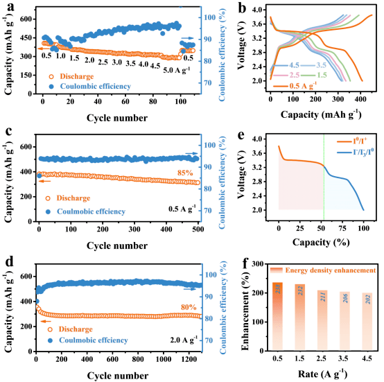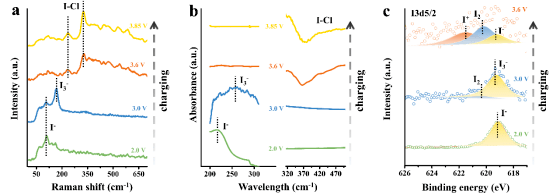 在揭示了MAI//Cl-LDL//Li电池全新的氧化还原化学后,我们评估了其在恒流模式下的电化学性能。图4a给出了电池在电流密度在0.5到5 A g-1之间的倍率性能。在0.5 A g-1时,放电容量达到408 mAh g-1,接近两电子转移化学的理论上限(422 mAh g-1)。随着电流的增加,容量在1.0、1.5、2.0、2.5、3.0、3.5、4.0、4.5和5.0 A g-1时分别保持在374、356、342、336、327、320、315、311、296 mAh g-1。即使在超高的5.0 A g-1条件下,放电容量保持率仍超过73%,表明电池具有优异的氧化还原动力学和可逆性。更令人印象深刻的是,在所有扫描率下,放电曲线中的两个放电平台始终保持完好(图4b)。当电流密度增加10倍时,仅能识别出微小的平台滞后:3.42 V平台为0.14 V, 2.91 V平台为0.16 V。另一个值得注意的优点是极低的充放电曲线极化,2.91 V平台处的极化值约为0.08 V,3.42 V 平台处的极化值仅为0.07 V。之后,我们测试了电池在0.5 A g-1低电流密度下的长效循环性能(图4c)。超过500个循环中,只有15%的容量衰减被识别,对应于每个循环容量衰减率低于0.03%。在2.0 A g-1电流密度下(图4d),超过1300个循环中仅有20%的容量衰减。通过对0.5 A g-1时的放电曲线进行简单的数学分析,我们发现新的转化化学的激活使可逆放电容量和能量密度加倍有余,如红色虚线所示(图4e)。即使在4.5 A g-1的情况下,能量密度的升高值仍可达到102%左右,显著提高了电池的实际应用能力(图4f)。之后,我们开展了一些列的光谱学实验表征来揭示双电子转化机制,包括固态UV-vis,Raman,XPS等技术手段。图5a给出了MAI电极在不同荷电状态(SOC)下的拉曼光谱。在2.0 V完全放电状态下,110 cm-1处检测到的最强峰归属于I-离子,类似于原始MAI材料。随着充电到3.0 V,167 cm-1左右出现了一个新的主导峰,而110 cm-1处峰位明显减弱,对应于I-向I3-的转化,为第一转化阶段。在3.6 V甚至3.85 V的完全充电状态下,Raman光谱进一步发生了显著变化,237 cm-1和328 cm-1位置处出现了两个新的峰位,是Cl-I键在第二转化阶段的延伸。此时,引入的Cl-离子与高电位下生成的I+离子结合。补充的UV-vis光谱验证了上述拉曼表征结果(图5b)。为了避免后续处理过程中可能的干扰,所有UV-vis光谱都是通过直接测量不同SOC下MAI电极的外表面来采集的。在这些谱图中,I-离子在2.0 V时的信号被识别在216 cm-1,I3-离子在3.0 V时的信号位于270 ~ 290 cm-1,明确展示了最初阶段下I-/I3-之间的氧化还原过程。当充电到较高的电压时,上述特征峰完全消失,在390-480 cm-1处出现新的UV-vis宽峰,这是由I3-在这一阶段不断被氧化成I+离子所致。XPS直接而精确地表征了MAI电极在氧化还原过程中I的价态演化。不出所料,高分辨的I3d XPS光谱在充电过程中出现红移,表明总体化合价的升高(图5c)。在完全放电状态下,只有一个位于619.1 eV处的峰被识别,与I-离子对应。在这个阶段,I-离子是主要的还原产物。当充电到3.0 V时,I3d5/2的峰可以很好地拟合成两部分,其中619.3 eV处的主导峰对应I3-阴离子,620.2 eV处的次峰对应I2。值得注意的是,当电压达到3.6 V时,I3d5/2峰进一步发生红移,在621.5 eV处出现的峰来源于I+离子,表明此时存在I3-或I2被氧化为正价态。为了在原子水平上进一步深入揭示新的双电子转化化学,我们开展了DFT计算,其中两个步骤的反应均从最初的I-离子开始。不同路径下氧化还原产物以及对应的内聚能分布如图6a所示,嵌图为优化后的氧化还原产物分子结构。我们采用计算的结果厘清了两个关键问题:游离Cl-是否有利于I+阳离子的生成和稳定,以及什么是最有可能的氧化还原产物?结果表明,在没有Cl-的情况下,I3-向I+的转化会经历一个高能垒的过程,而I+的结合能不足意味着它们的热力学不稳定。Cl-的引入显著降低了I3-离子向I+离子转变的能垒。此外,计算结果表明卤素间氧化还原产物更倾向于I-Cl,而不是I-Cl2。恶劣的低温条件往往导致电池反应迟缓,可逆性差,引发容量的快速衰减甚至失效,限制了电池的应用场景。因此,我们进一步评估了这种新型转化型电池在25°C至-30°C范围内的环境适应性。图7a为MAI//Cl-LDL//Li电池的容量随温度变化的曲线图,该结果表明电池在广阔的温度区间内始终运行稳定,其容量随着温度的降低而衰减。值得注意的是,在-30°C的极端温度下,电池仍能提供51%的室温容量,而未发生故障。图7b给出了电池在25°C、-25°C和-30°C下的充放电曲线,包含的两对明显充放电平台有力地证明了I-/I+氧化还原化学是温度不敏感的。此外,在-25°C下的长效服役测试中,电池表现出良好的循环耐久性,其在2500个循环中仅牺牲20%的容量,同时保持接近100%的库仑效率(图7d)。2节串联的纽扣电池可以在-25℃下为大尺寸的冷面板持续供电(160mm × 100mm)(图7e)。针对传统单电子转化型有机锂碘电池的低电压、低容量等问题,我们创造性的提出了一种高效的卤素间化合物活化策略,通过简单的电解液改性实现了前所未有的两电子转化机制的有机锂碘电池。激活的I0/I+氧化还原对极大的提高了电池的电化学性能,远超单电子型同类物。具体来说,新型锂碘电池在3.42 V电压处释放了一个新的高放电平台,将放电容量提升到惊人的408 mAh g-I。更值得注意的是高平台将能量密度提升到原始数值的238%,显著提升了电池输出能力。此外,新型氧化还原机制表现出卓越的低温适应性,极大的拓宽了电池的应用场景。开发的高效卤素间化合物策略有望拓展到其他卤素基转化储能体系。Dr. Ch