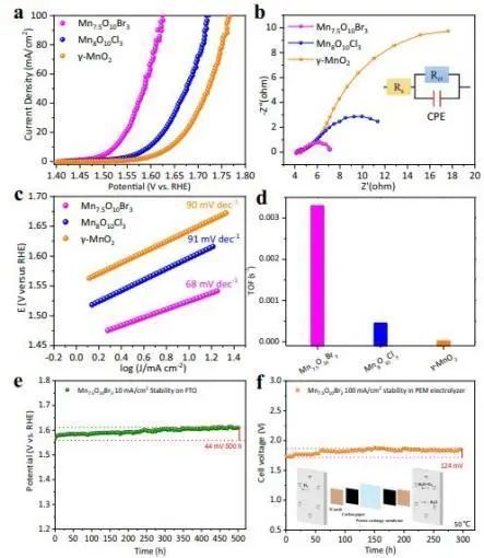 开发在酸性介质中用于析氧反应(OER)且具有优异活性和耐久性的非贵金属催化剂对于电解水制氢至关重要。但是,非贵金属催化剂OER催化剂的活性和稳定性不足,要克服其以上缺点仍然是一项严峻的挑战。基于此,南开大学张晓丹、Michael Graetzel和丹麦技术大学王振斌等报告了一种具有成本效益且稳定的溴氧化锰(Mn7.5O10Br3)催化剂,在酸性电解质中表现出优异的OER活性。该化合物在近30年来首次报道,但从未应用于电催化。在0.5 M H2SO4溶液中,Mn7.5O10Br3在10 mA cm-2的电流密度下表现出295±5 mV的OER过电位,并且在10 mA cm-2的电流密度下保持良好的稳定性(至少500小时);在50°C的PEM电解槽中使用Mn7.5O10Br3催化剂,在施加100 mA cm-2的恒定电流后,在300小时的电解过程中观察到电池电压增加了124 mV。这一性能优于最先进的无贵金属催化剂并且可与含贵金属的催化剂(例如IrOx或SrIrO3)相媲美。采用原位拉曼光谱结合密度泛函理论(DFT)计算来研究不同Mn基材料(γ-MnO2和Mn-OX,X = Cl,Br)的催化活性和稳定性。实验和计算表明,由于催化剂自氧化过程,在OER过程中会形成紧密堆积的氧化物表面,从而产生出色的长期稳定性和OER反应的活性相。此外,卤素离子的存在为催化剂提供了增强的电子传输能力,进一步提高了OER活性。Efficient and Stable Noble-Metal-Free Catalyst for Acidic Water Oxidation. Nature Communications, 2022. DOI: 10.1038/s41467-022-30064-6